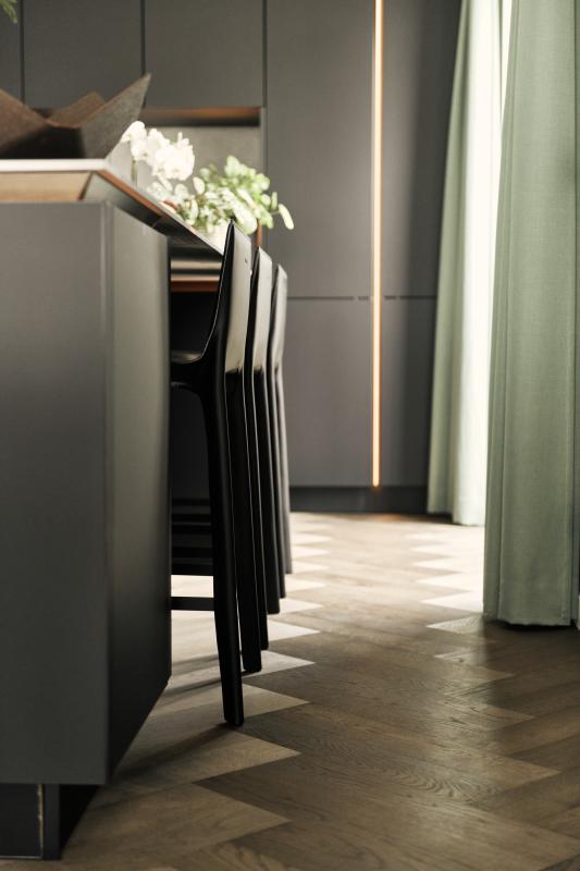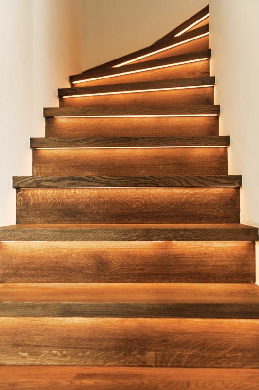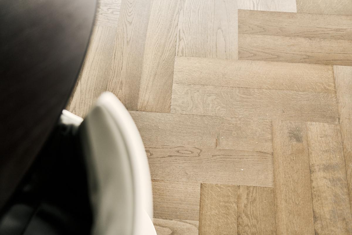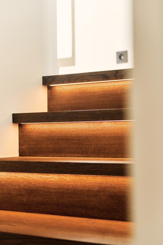 In een woning in Antwerpen plaatsten we een warme visgraatparket: licht geborstelde eik die met zwarte olie werd gekleurd. Ook de trap werd op maat gemaakt en voorzien van verlichting.